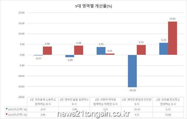 5대 분야 중 ‘문화를 창조하고 연대하는 도시’ 영역이 15.8%로 개선율이 가장 높았으며, ‘사회적 약자와 함께하는 따뜻한 도시’ 영역 개선율이 0.7%로 가장 낮게 나타났다.