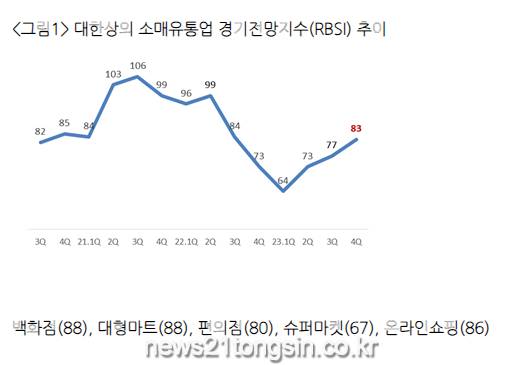 대한상공회의소(회장 최태원)는 소매유통업체 500개사를 대상으로‘4분기 소매유통업 경기전망지수(RBSI)’를 조사한 결과, 전망치가‘83’으로 집계됐다고 15일 밝혔다.