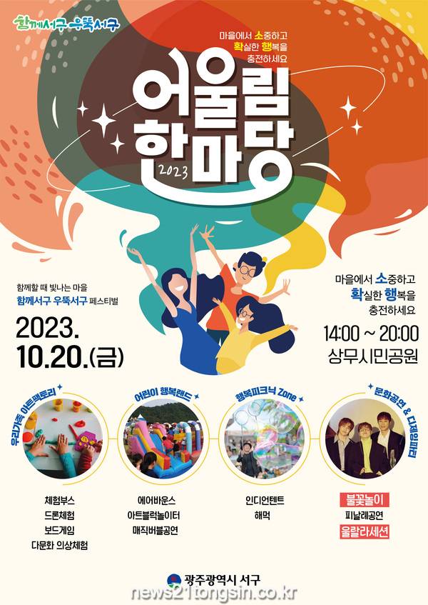 [뉴스21통신/장병기 기자] 9만 서구민이 마을 공동체 안에서 소통하고 화합하는 축제의 장이 펼쳐진다. 광주광역시 서구(구청장 김이강)는 오는 20일 상무시민공원 일원에서 ‘2023 어울림한마당’을 개최한다고 밝혔다.