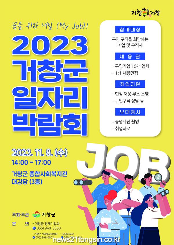 거창군은 오는 11월 8일 오후 2시 거창군 종합사회복지관 대강당(3층)에서 ‘꿈을 위한 내일(My Job)! 2023년 거창군 일자리 박람회’를 개최한다고 17일 전했다.