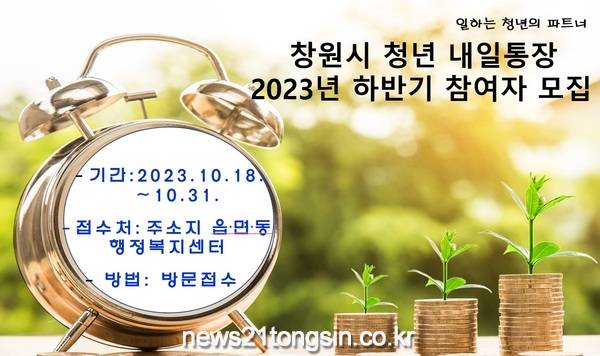 창원특례시(시장 홍남표)는 지역 근로 청년의 희망 적립 자산형성을 지원하기 위해 ‘2023년 하반기 청년 내일 통장 사업’ 참여자 300명을 모집한다고 밝혔다.