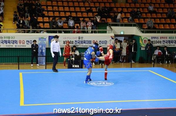 [뉴스21통신 박찬웅 기자] 16일 보성군 다향체육관에서 진행 중인 제104회 전국체육대회 우슈 일반부 결승에서 56kg 체급 빨강 유니폼 윤웅진, 파랑 유니폼 홍민준 선수가 경기를 치르고 있다.한편, 전국체전은 19일까지, 장애인 체전은 11월 3일부터 8일까지 전라남도 일원에서 개최되며, 보성군에서는 18일까지 여자축구가 진행된다.