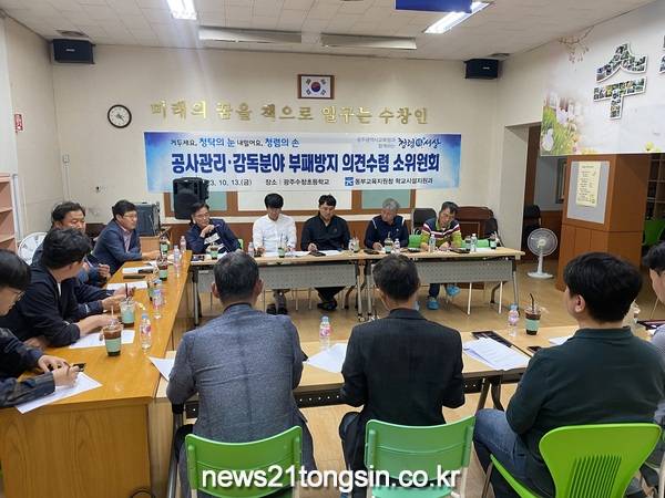 [뉴스21통신/장병기 기자] 광주동부교육지원청이 지난 13일 광주수창초 공사 현장에서 공사관계자들과 함께 공사 관리·감독 분야 부패방지 의견 수렴을 위한 소위원회를 개최했다.