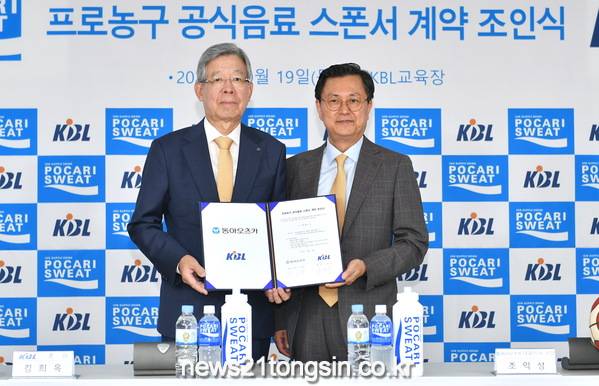 이날 조인식에는 동아오츠카 조익성 대표이사 사장(사진 오른쪽)을 비롯한 동아오츠카 관계자와 KBL 김희옥 총재(사진 왼쪽) 등이 참석했다.
