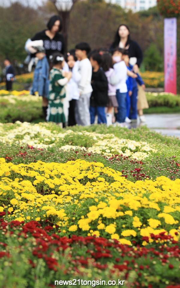 2023 대한민국 국향대전 개막을 하루 앞운 19일 오전, 축제가 열리는 엑스포공원 중앙광장에 아이들이 형형색색의 아름다운 국화를 관람하고 있다.