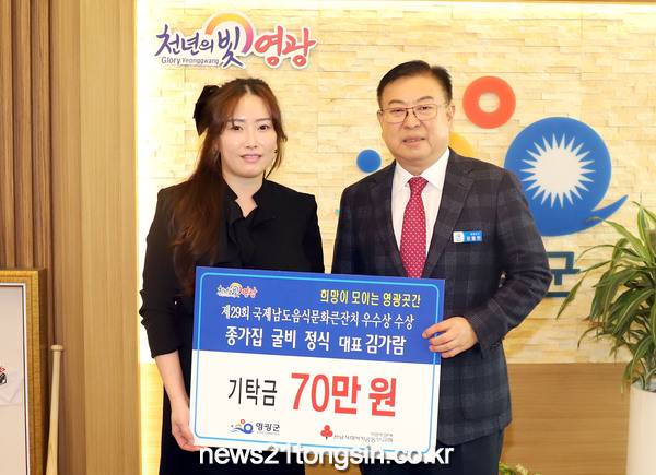 지난 19일 영광읍 천년로에 위치한 종가집 굴비정식 김가람 대표가 “제29회 국제남도음식문화큰잔치”에서 전시부 부문 우수상을 수상하여 상금 70만 원을 영광곳간에 전달하였다.