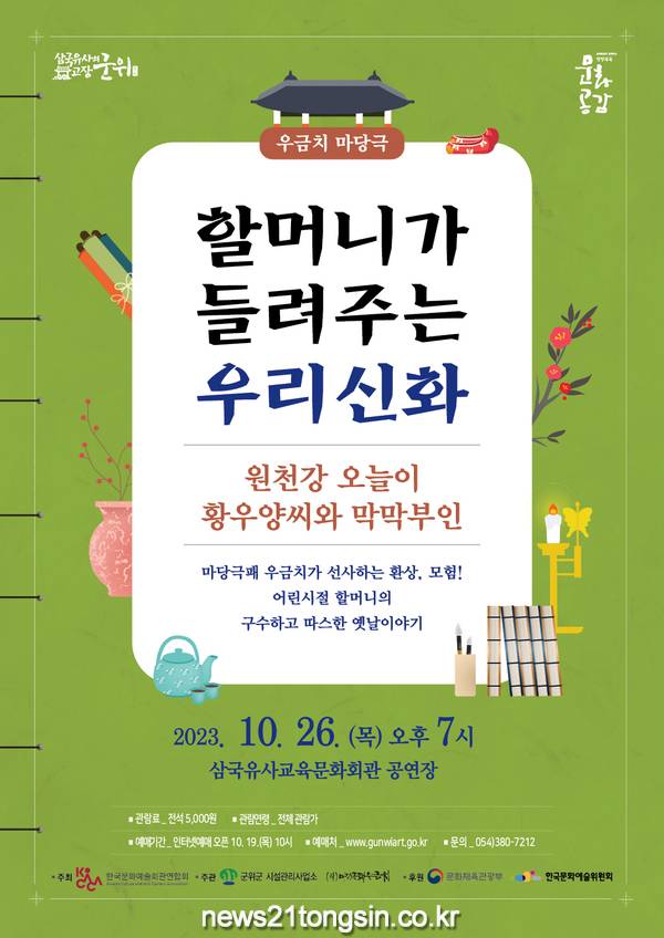 우리 민족이 가지고 있는 고유한 삶의 이야기를 담은 신화이야기를 무대로 옮긴 마당극 ‘할머니가 들려주는 우리신화’가 10월 26일 오후 7시 삼국유사교육문화회관 공연장 무대에 오른다.