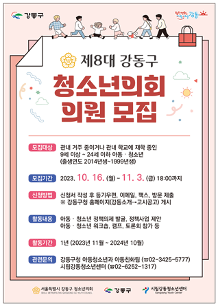 신청은 강동구에 거주 또는 재학 중인 9세 이상 24세 이하 아동·청소년이라면 누구든지 가능하며, 50명 이내로 선발할 예정이다. 관심 있는 청소년은 강동구청 홈페이지 ‘고시/공고’란에서 신청서와 개인정보제공동의서 등을 내려받아 작성한 후 전자우편, 등기우편, 방문, 팩스 등을 통해 제출하면 된다. 선정 결과는 11월 8일 강동구청 홈페이지를 통해 발표되며, 선정된 아동·청소년은 11월부터 활동을 시작할 예정이다.