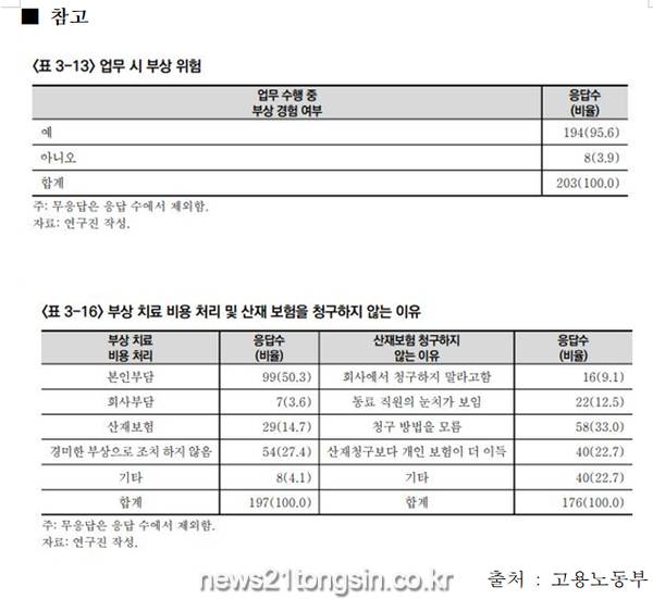 한편 ‘부상 치료 비용 처리’에 관한 질문에 응답자의 절반이 본인부담했다고 답했다. 산재보험으로 처리했다는 응답은 14.7%(29명), 회사가 부담했다는 응답은 3.6%(7명)에 불과했다. ‘산재보험을 청구하지 않는 이유’에 대해서는 ‘회사에서 청구하지 말라고 한다’는 응답도 9.1%(16명)로 나타났다.