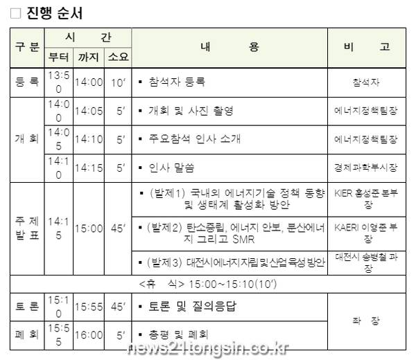 한국에너지기술연구원 홍성준 연구전략본부장은 ‘국내외 에너지기술 정책 동향 및 생태계 활성화 방안’을, 한국원자력연구원 이영준 정책연구부장은‘탄소중립, 에너지 안보, 분산에너지 그리고 SMR’을 주제로 발표하고, 송병철 대전시 에너지정책과장은 ‘대전시 에너지 자립 및 산업 육성 방안’을 주제로 발표할 예정이다.