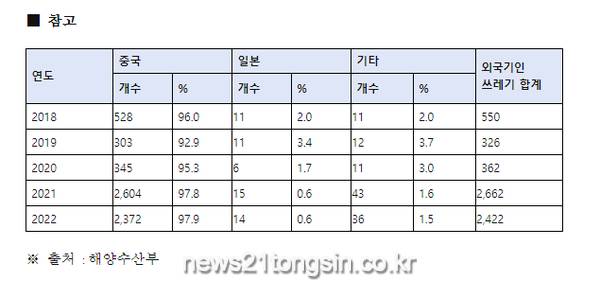 지난해 수거된 외국발 해안쓰레기를 국적별로 보면, △중국발 2,372개(97.9%), △일본발 14개(0.6%), △기타 36개(1.5%)로 나타났다. 특히 중국발 해안쓰레기는 2018년 528개에서 2022년 2,372개로 5년 만에 약 4.4배 늘어났다.