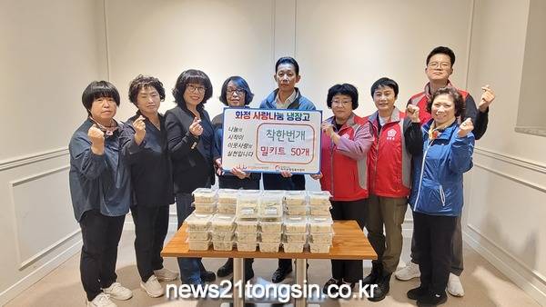(뉴스21통신/임정훈기자) = 동구 화정동 주민 친목단체 「착한번개모임」이 지난 25일 오전 11시 화정동 행정복지센터에서 「화정 사랑나눔 냉장고」에 청국장 밀키트 50개를 기부하여 기부 릴레이를 이어나갔다.