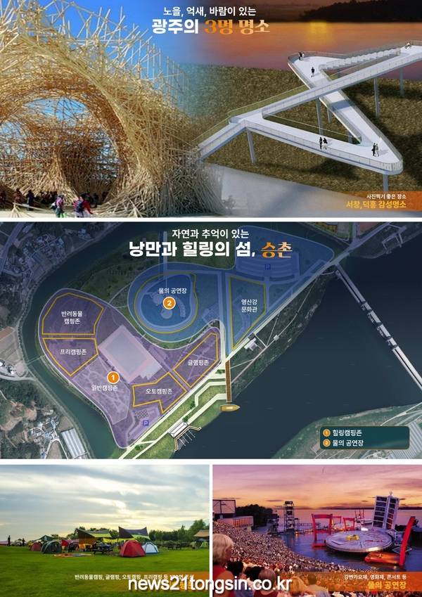 승촌섬은 자연과 추억이 가득한 ‘낭만과 힐링의 섬’으로 재탄생한다. 이곳에는 반려동물 캠핑장, 글램핑장, 오토캠핑장 등 170면의 힐링캠핑장을 조성, ‘캠핑 메카’로 만든다. 이곳에는 강변가요제, 영화제, 콘서트 등 물 위에서 펼쳐지는 공연 극장인 ‘빛고을 수상 공연장’도 조성한다.
