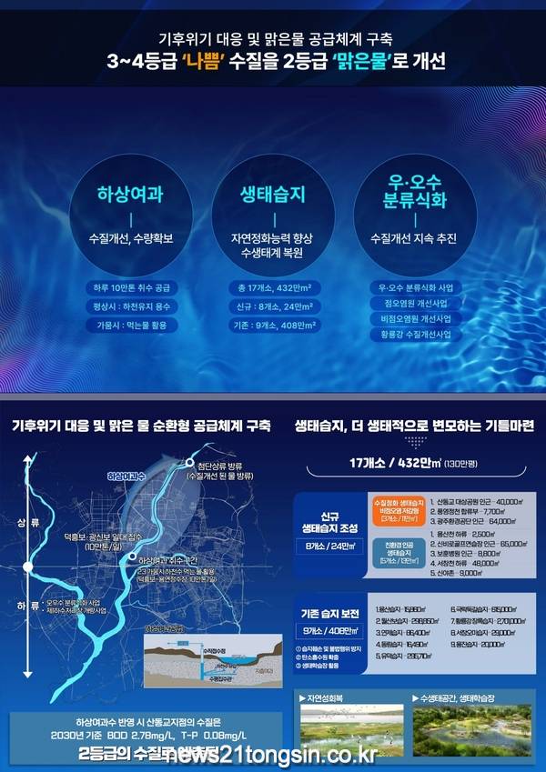 ▲ 광주의 3멍 명소, 낭만과 힐링의 섬, 승촌광주시는 2030년까지 영산강에 2등급의 맑은 물이 흐르도록 하상여과공법으로 하루 10만톤의 맑은 물을 취수해 가뭄 등 위기 때에는 먹는물로 활용하고, 평상시에는 영산강 유지용수로 사용하는 1석2조의 순환형 공급체계 구축할 계획이다. 또 영산강 오염원을 저감하는 신규 습지 8곳, 기존 습지 9곳을 보강해 하천 고유의 자정기능 강화하고, 하수도 정비기본계획에 따라 추진 중인 하수관로 분류식화(오수와 우수 분리) 사업, 점오염 개선사업, 비점오염 개선사업, 황룡강 수질개선사업을 지속 추진한다.