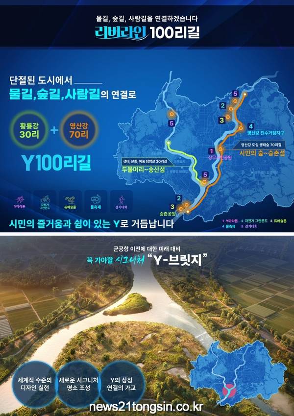 영산강과 황룡강 두 강이 만나는 합류부에 ‘Y브릿지’를 조성한다. 인간과 자연, 기술과 예술이 만나 소통하는 길의 역할을 하게 될 Y브릿지는 군공항 이전과 맞물려 ‘새로운 광주의 중심’으로 떠오를 것으로 전망된다.