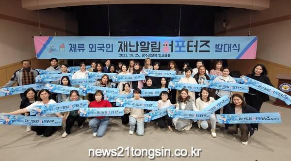 광주경찰청(공공안녕정보외사과)은 외국인을 위한 재난알림 공백을 채우고 우리지역에 체류 중인 외국인의 재난피해를 최소화 하기 위해 25일 광주경찰청 빛고을홀에서 긴급재난문자를 외국어로 번역해 SNS에 업로드하는 ‘재난알림 서포터즈’를 발족했다. 서포터즈는 평소 경찰수사 통역요원으로 활동하는 내·외국인 36명으로 구성했다.
