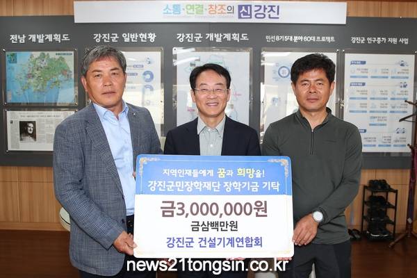 [뉴스21통신 박찬웅 기자] 강진군건설기계연합회(회장 김길현)가 25일 강진군민장학재단(이사장 강진원)에 장학기금 300만 원을 기탁했다.