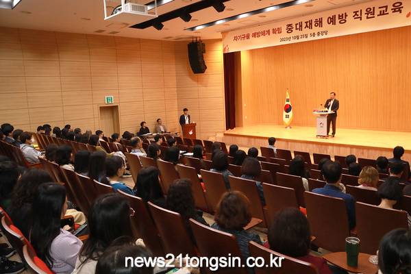(뉴스21통신/임정훈기자) = 울산 동구(동구청장 김종훈)는 10월 25일 동구청 5층 중강당에서 현업근로자 등 직원 600여명을 대상으로 중대재해예방 교육을 실시하였다.