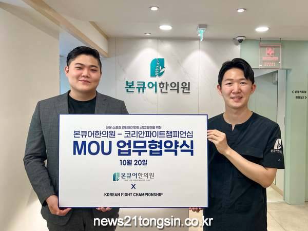 본큐어한의원(대표원장 송정현)은 10월 20일 코리안파이트챔피언십(대표 임동준)과 전문 스포츠 엔터테인먼트 산업 발전을 위한 상호협력 업무협약(MOU)을 체결했다고 밝혔다.