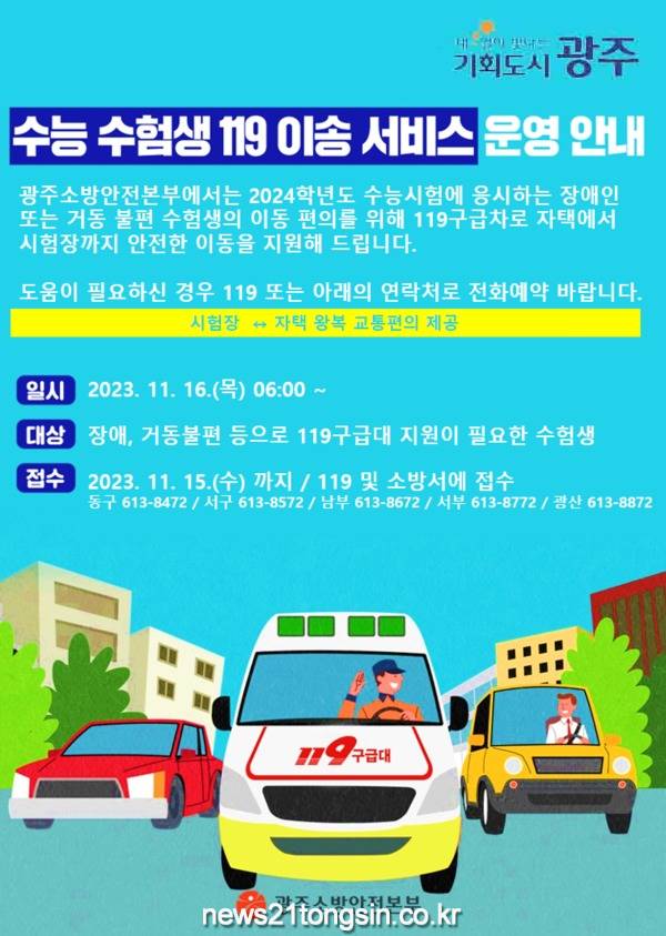 [뉴스21통신/장병기 기자] 광주광역시소방안전본부는 오는 16일 실시하는 2024학년도 대학수학능력시험 수험생 편의를 지원하기 위해 ‘119이송 서비스’를 제공한다.