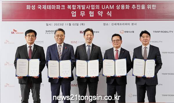 한국공항공사, 한화시스템, SK텔레콤, 티맵모빌리티가 참여하고 있는 ‘K-UAM 드림팀’ 컨소시엄은 2일, 신세계프라퍼티와 ‘화성국제테마파크 복합개발사업의 도심항공교통(UAM) 상용화 추진을 위한 업무협약(MOU)’을 체결했다.
