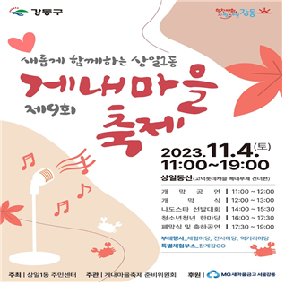 박홍우 상일1동장은 “게내마을축제를 통해 새로운 주민과 기존 주민들이 교류하고 소통할 수 있는 기회의 장이 되길 바란다.”며 “가을날 어린이, 청소년, 어르신 등 모든 세대가 함께 즐기고 어울릴 수 있는 축제를 준비했으니 주민 여러분들의 많은 관심과 참여 부탁드린다.”고 전했다.
