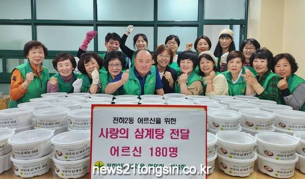 (뉴스21통신/임정훈기자) = 울산 동구 전하2동 새마을협의회(회장 김기명)와 부녀회(회장 김옥련)는 11월 2일 오전 10시 30분부터 회원들과 정성스럽게 준비한 삼계탕을 관내 경로당 이용 어르신과 저소득 어르신 등 180명에게 전달하는 행사를 가졌다.