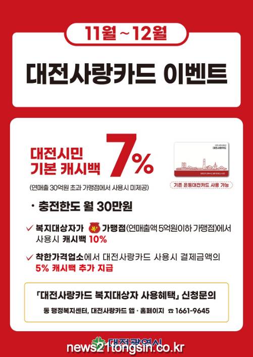 대전시는 11월 1일부터 12월 31일까지 두 달 동안 코리아세일페스타와 연말을 맞아 경제 활력을 위한 ‘대전사랑카드 연말 이벤트’를 추진한다.