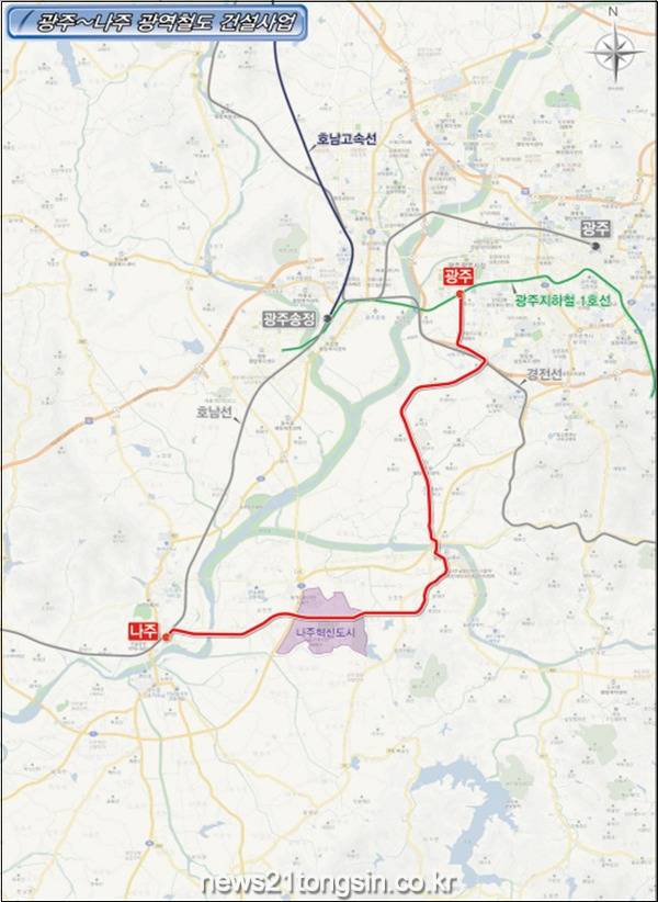 ▲ 광주~나주 광역철도 노선도[뉴스21통신/장병기 기자] ‘광주~나주 광역철도’는 광주·전남 공동혁신도시의 정주여건 개선 등 지역경제 활성화를 위해 광주시와 전남도가 함께 예비타당성 조사 통과를 위해 총력 추진하고 있다.