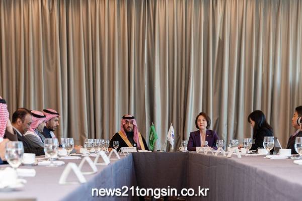 사우디아라비아 중소기업청인 몬샤아트의 사미 알 후사이니 청장(가운데 왼쪽)과 이영 중소벤처기업부 장관(가운데 오른쪽)이 서울에서 양국의 중소기업 및 스타트업 협력을 위한 양자회담을 개최하고 협력 증진 방안에 대해 논의하고 있다(제공=사우디아라비아 중소기업청 몬샤아트)