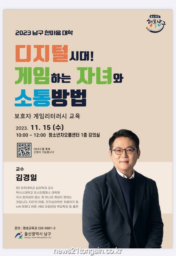 (뉴스21통신/최원영기자)=울산 남구(구청장 서동욱)는 오는 15일 청소년차오름센터 1층 강의실에서 아주대학교 심리학과 김경일 교수를 초청해 ‘디지털 시대! 게임하는 자녀와 소통방법’을 주제로 남구 한마음대학 강연을 개최한다고 밝혔다.