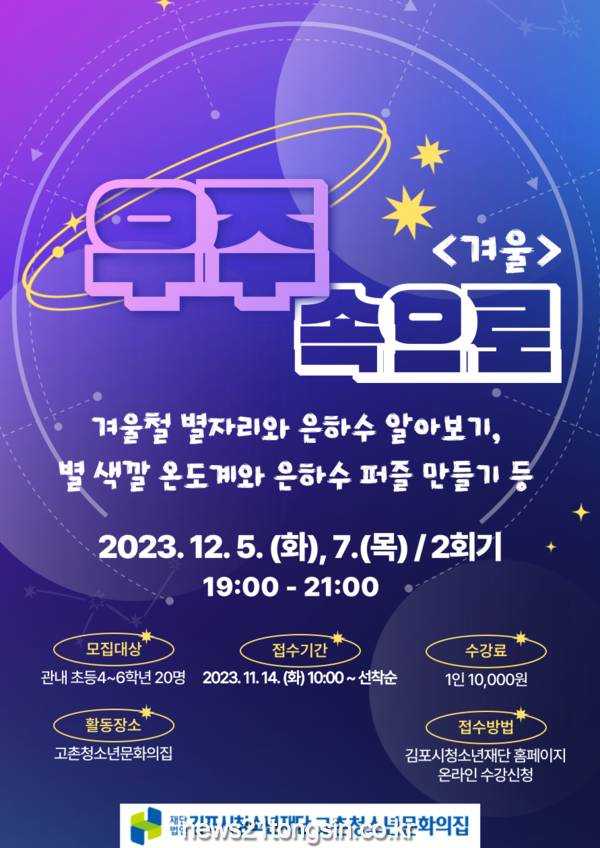 ▲ 사진=김포시(재)김포시청소년재단 고촌청소년문화의집에서는 관내 청소년에게 천문·우주에 대한 체험활동 및 정보제공을 통한 과학적 지식과 창의력 함양 및 전문적 능력을 향상할 수 있는 기회를 마련하기 위해 ‘우주속으로 <겨울>’을 운영한다.