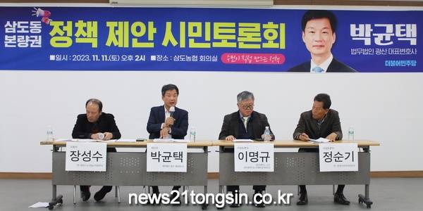 민주당 이재명 대표 법률특보인 「법무법인 광산」 박균택 변호사는 11. 11.(토) 오후 2시 광주 삼도농협 회의실에서 삼도‧본량권 주민 등과 함께 정책 제안·토론회를 열고, 광주형 일자리 완성을 위한 전용 주거단지 조성 방안에 대하여 깊이 있는 논의를 했다. 박 변호사의 발제로 시작한 이날 토론회는 장성수 전 광주시 도시철도건설본부장이 사회자, 이명규 광주대학교 교수(전 광주도시계획위원회 부위원장), 정순기 전 본량주민자치위원회 위원장 등이 지정토론자로 나섰으며, 약 80명의 주민이 참여하여 의견을 교환했다.