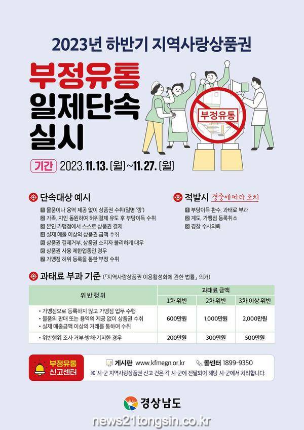 김해시는 13일부터 27일까지 15일간 김해사랑상품권 부정유통 일제단속을 실시한다고 밝혔다.