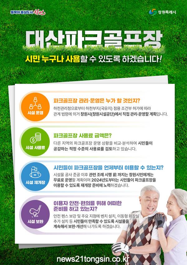 앞으로 대산파크골프장 시설관리·운영은 창원시설공단에서 직접 운영할 계획으로, 관련 조례 시행 前 시범 운영 등을 통해 도출되는 문제점을 보완하여 정상적으로 시설을 운영할 예정이다.