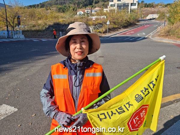 11월 초 어느 아침, 울산 북구 강동초등학교와 강동고등학교 등굣길에서 교통안전 지도를 하고 있는 강찬순 할머니를 만났다.