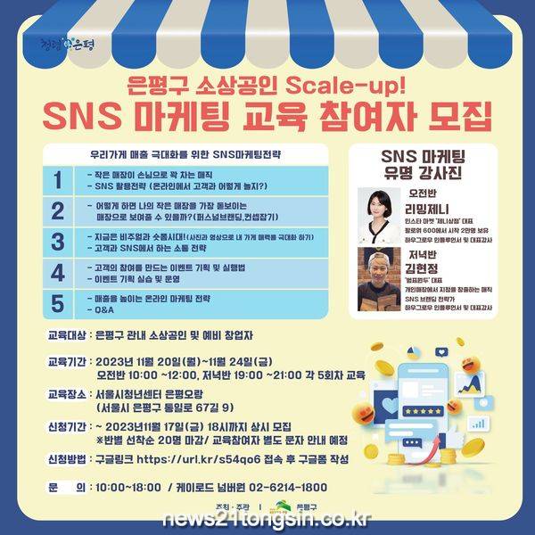 ‘소상공인 교육(Scale-up!)’은 은평구 관내 소상공인과 예비 창업자를 대상으로, ‘SNS 마케팅 교육’ 5회, ‘역량 강화 특강’ 3회 등 총 2개 과정으로 구성된다.