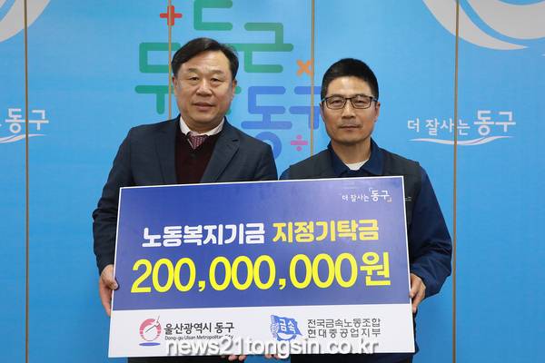(뉴스21통신/임정훈기자) = 울산시 동구청과 전국금속노조 현대중공업지부(지부장 정병천)는 11월 21일 오후 3시 구청장실에서 김종훈 구청장과 현대중공업 노조위원장인 정병천 지부장 등 노조 관계자가 참석한 가운데 울산광역시 동구 노동복지기금 2억원 전달식을 개최했다.