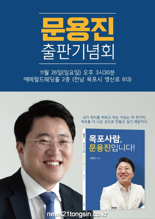 [뉴스21통신 박민창기자] 11월 26일, 목포 에메랄드 웨딩홀에서 문용진 부부요양병원 병원장의 저서 '목포사람 문용진입니다'의 출판기념회가 열린다고 알려졌다.