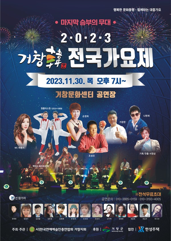 한편, 2023 거창한(韓) 전국 가요제를 주최·주관하는 (사)한국연예예술인총연합회 거창지회는 거창 대중음악 예술 발전과 지역민 문화 향유 향상을 위해 힘쓰고 있으며 ‘행복한 문화동행, 함께하는 대중가요’를 주제로 군민의 문화 행복 지수를 높이기 위해 노력하고 있다.
