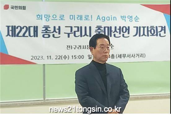 박영순 전 구리시장이 2024년 제22대 국회의원 출마를 공식 선언했다. 국민의힘 구리지역 소속인 박 전 시장은 22일 자신의 사무실에서 기자회견을 갖고 “다시한번 희망으로 미래로 구리시를 일자리가 넘치는 자족도시의 선봉장이 되겠다”고 밝혔다.