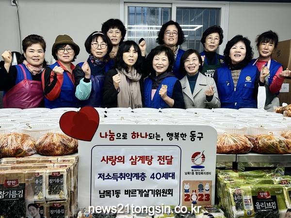 (뉴스21통신/임정훈기자) = 울산 동구 남목1동 바르게살기위원회(위원장 김명순)는 저소득 한부모 및 독거노인 등 40가구에 전달해 달라며 11월 22일 오전 11시 직접 만든 삼계탕 및 김치 반찬 세트를 기탁했다.