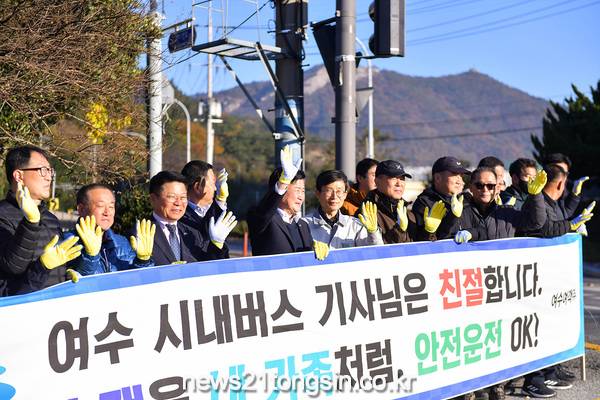 여수시는 지난 21일 시내버스 차고지(미평·둔덕)에서 정기명 시장을 비롯해 시내버스 3개 업체 운수종사자, 시 관계 공무원 등 100여 명이 참석한 가운데 ‘시내버스 친절도 UP! 급출발‧급제동 STOP!’ 캠페인을 펼쳤다.