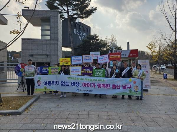 (뉴스21통신/최원영기자)=울산 남구(구청장 서동욱)는 23일 ‘아동학대 예방의 날’을 맞아 울산대공원 정문에서 울산남부아동보호전문기관(관장 도영옥) 관계자들과 함께 아동학대예방 캠페인을 개최했다.