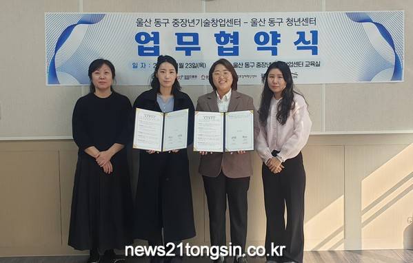 (뉴스21통신/임정훈기자) = 울산 동구청년센터는 11월 23일 오후 2시 울산 동구 중장년 기술창업센터에서 울산 동구 중장년 기술창업센터(조희철 센터장)와 울산 동구지역 창업 활성화를 위한 업무 협약을 체결하였다.