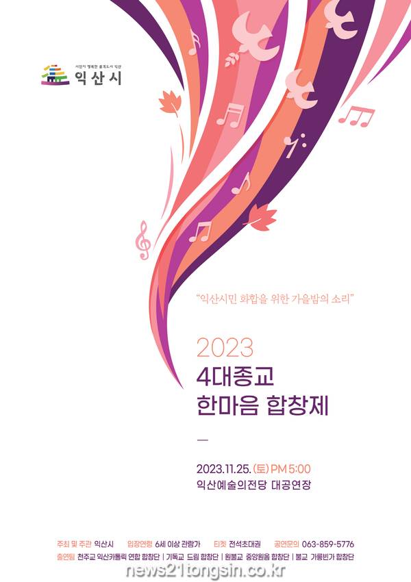 익산시는 종교를 넘어 지역사회의 화합과 통합을 이루기 위한 4대 종교 한마음 합창제를 25일 익산예술의전당에서 개최한다.