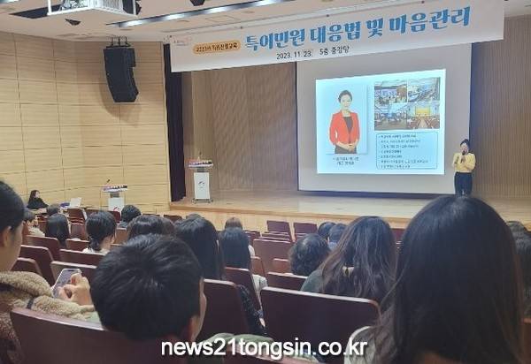 (뉴스21통신/임정훈기자) = 울산시 동구청은 구민의 입장에서 공감하는 시간을 마련함으로서 구민 행정서비스를 높이기 위해 11월 23일 동구청 5층 중강당에서 대민담당 공무원 350명을 대상으로 ‘2023년 직원 친절교육’을 실시하였다.