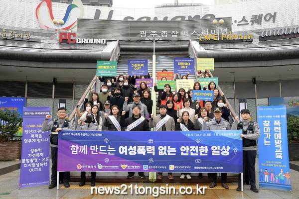 [뉴스21통신/장병기 기자] 광주광역시는 ‘2023년 여성폭력 추방주간’(지난 11월25일~12월1일)을 맞아 27일 오전 유스퀘어 광장에서 광주자치경찰위원회, 광주지방경찰청, 광주시교육청, 광주여성가족재단, 여성폭력피해자지원시설협의회 등 유관기관과 함께 여성폭력 근절을 위한 캠페인을 실시했다.