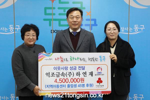 이번 성금은 동구의 지역아동센터 9곳에 전달되어 이번에 초등학교를 졸업하는 어린이들에게 졸업선물을 지원하는데 쓰인다.