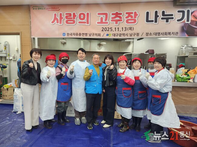 (뉴스21통신) 권혜선기자 = 자유총연맹 대구남구지회(회장 김학민)는 지난 13일 관내 취약계층을 위한 “사랑의 고추장 나누기” 행사를 개최하였다. ▲ 남구청(사진제공) 김학민 회장 등 자유총연맹 회원 30여 명은 지난 13일 대명사회복지관에 모여 직접 엿물을 달이고 고춧가루 및 메주가루 등을 배합하여 고추장 380통을 만들었다....